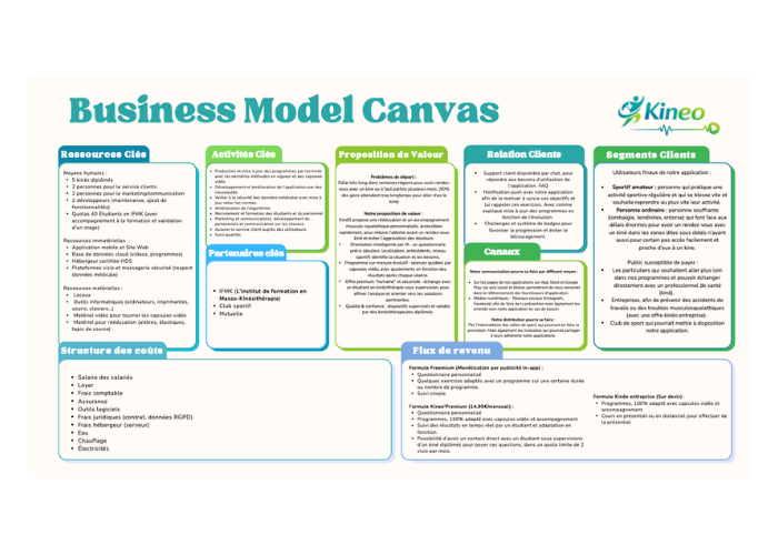Nous avons construit le Business Model Canvas de Kineo afin de structurer notre idée d’entreprise de manière claire et cohérente. Nous avons d’abord défini notre proposition de valeur, en mettant en avant une application digitale destinée à accompagner les personnes souffrant de problèmes musculaires et à répondre au manque de rendez-vous chez les kinésithérapeutes.