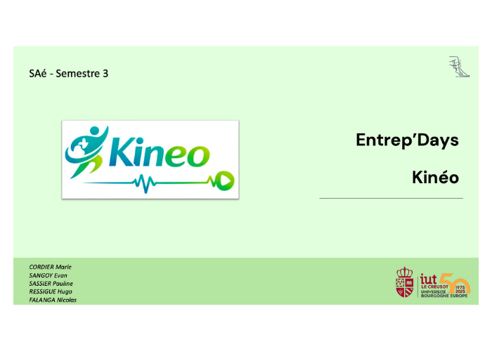 Ce projet s’est déroulé sur plusieurs semaines dans le cadre de la SAE Démarche de création d’entreprise. Réalisé en groupe, il avait pour objectif de nous placer dans une situation concrète de création d’entreprise, de l’idée initiale à la structuration du projet. Dans ce cadre, nous avons imaginé Kineo, une entreprise spécialisée dans une application digitale destinée à accompagner les personnes souffrant de problèmes musculaires, en réponse au manque de rendez-vous et aux délais d’attente trop longs chez les kinésithérapeutes.