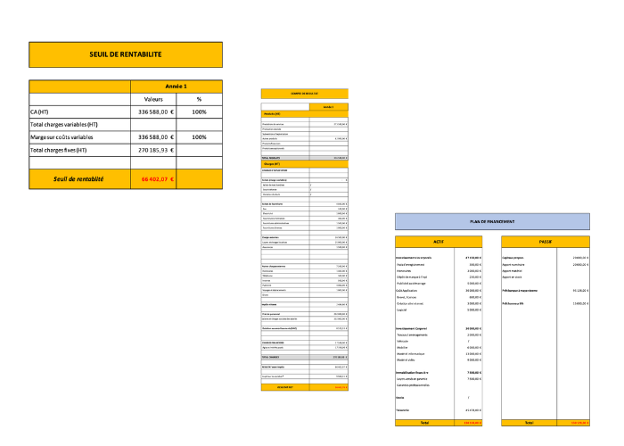 Nous avons également réalisé les principaux documents comptables de Kineo afin d’évaluer la viabilité financière de notre entreprise. Nous avons élaboré un plan de financement initial, un compte de résultat prévisionnel ainsi qu’un seuil de rentabilité pour estimer les besoins de départ, anticiper les charges et les revenus, et mesurer à partir de quel moment l’activité pouvait devenir rentable.